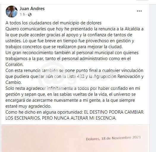Quiero comunicarles que hoy he presentado la renuncia a la Alcaldía a la que pude acceder gracias al apoyo y la confianza de tantos de ustedes. Lo que fue breve en tiempo fue provechoso en gestión y trabajos concretos que se realizaron para mejorar la ciudad.