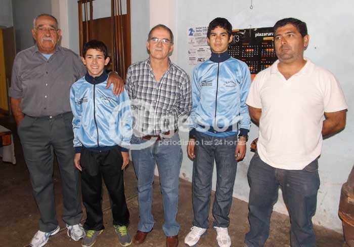 FOTO: Directivos del Club Atenas y dos de los corredores que defenderán a la institución celeste este domingo (de izquierda a derecha: Alfredo Morales, Enzo Bochi, Nelson Verdes, Matías Olivera y Rody Bochi.