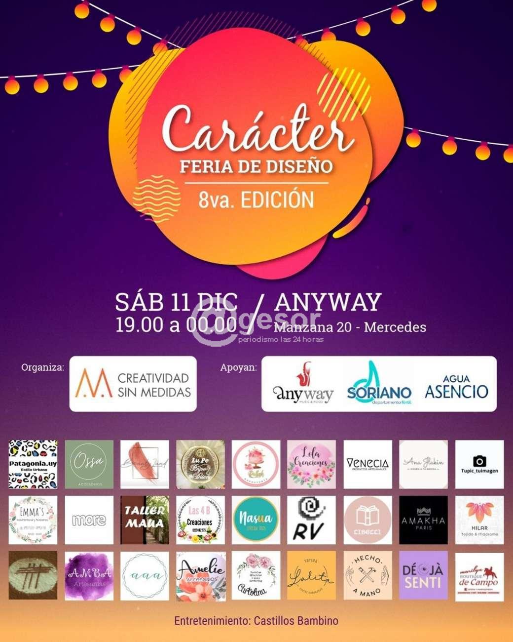 Con la organización de M Creatividad sin Medidas y el apoyo de Anyway, Intendencia de Soriano y Agua Asencio se desarrolla este sábado 11 de 19.00 a 24.00 horas en Manzana 20 en Paseo del Puerto en Mercedes, la 8ª edición de la Feria de Diseño denominada CARÁCTER con la presencia de múltiples firmas y empresas que estarán exhibiendo sus productos y creaciones.