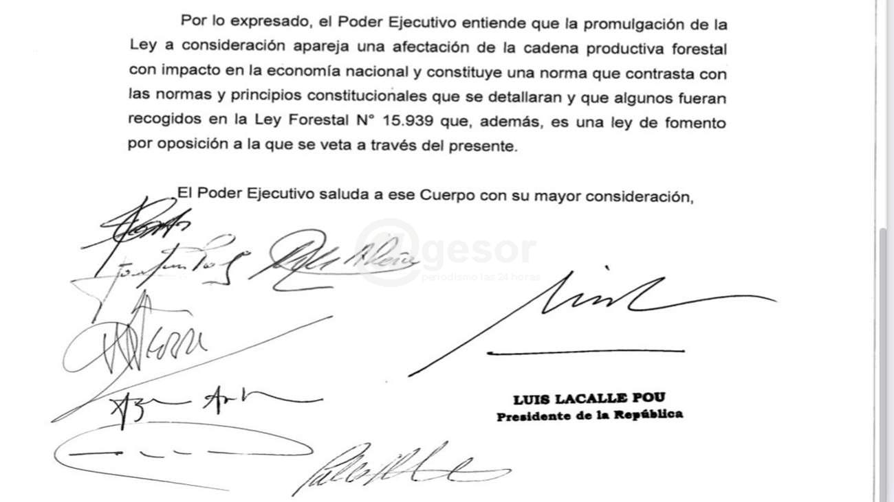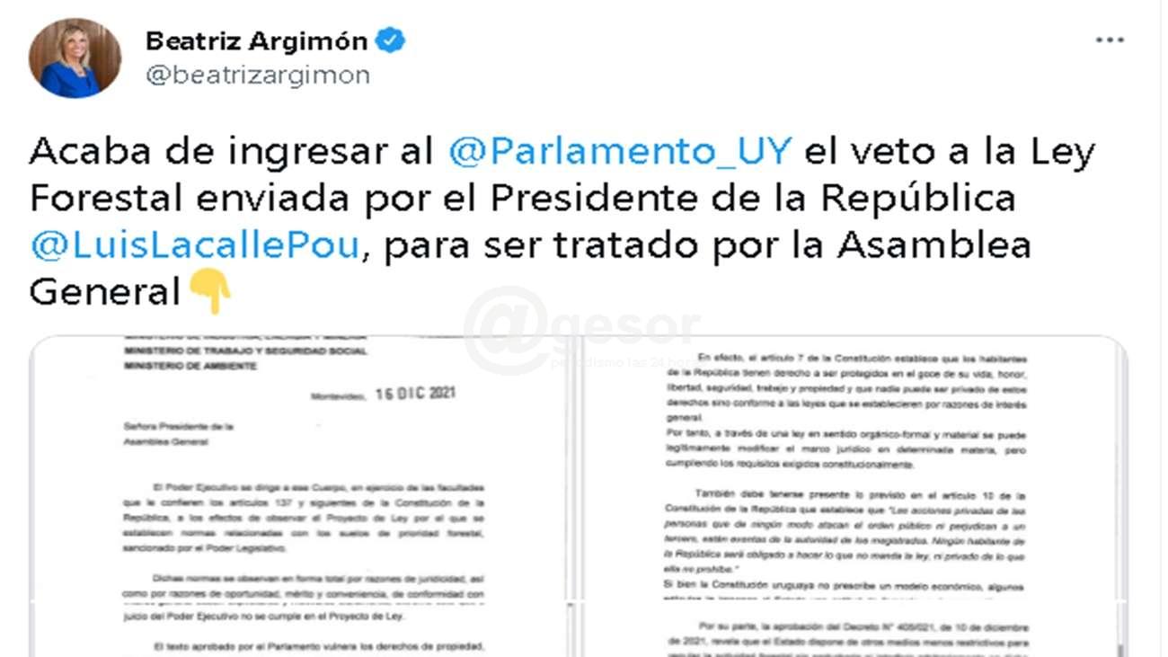 “Acaba de ingresar al Parlamento el veto a la Ley Forestal enviada por el Presidente de la República”, así lo anunció esta mañana la Vicepresidenta de la República Beatriz Argimón en su cuenta de twitter.