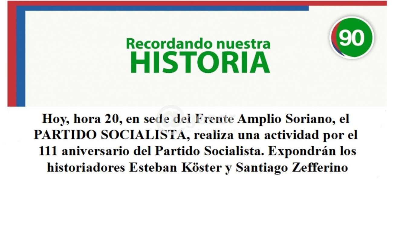 Hoy hora 20.00, en sede del Frente Amplio Soriano el PARTIDO SOCIALISTA, realiza una actividad por el 111 aniversario del Partido Socialista. Expondrán los historiadores Esteban Köster y Santiago Zefferino