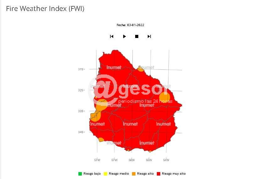 En tanto INUMET en su reporte diario establece que el índice meteorológico de incendios forestales sigue siendo muy alto; en base a la escala Fire Weather Index (FWI).