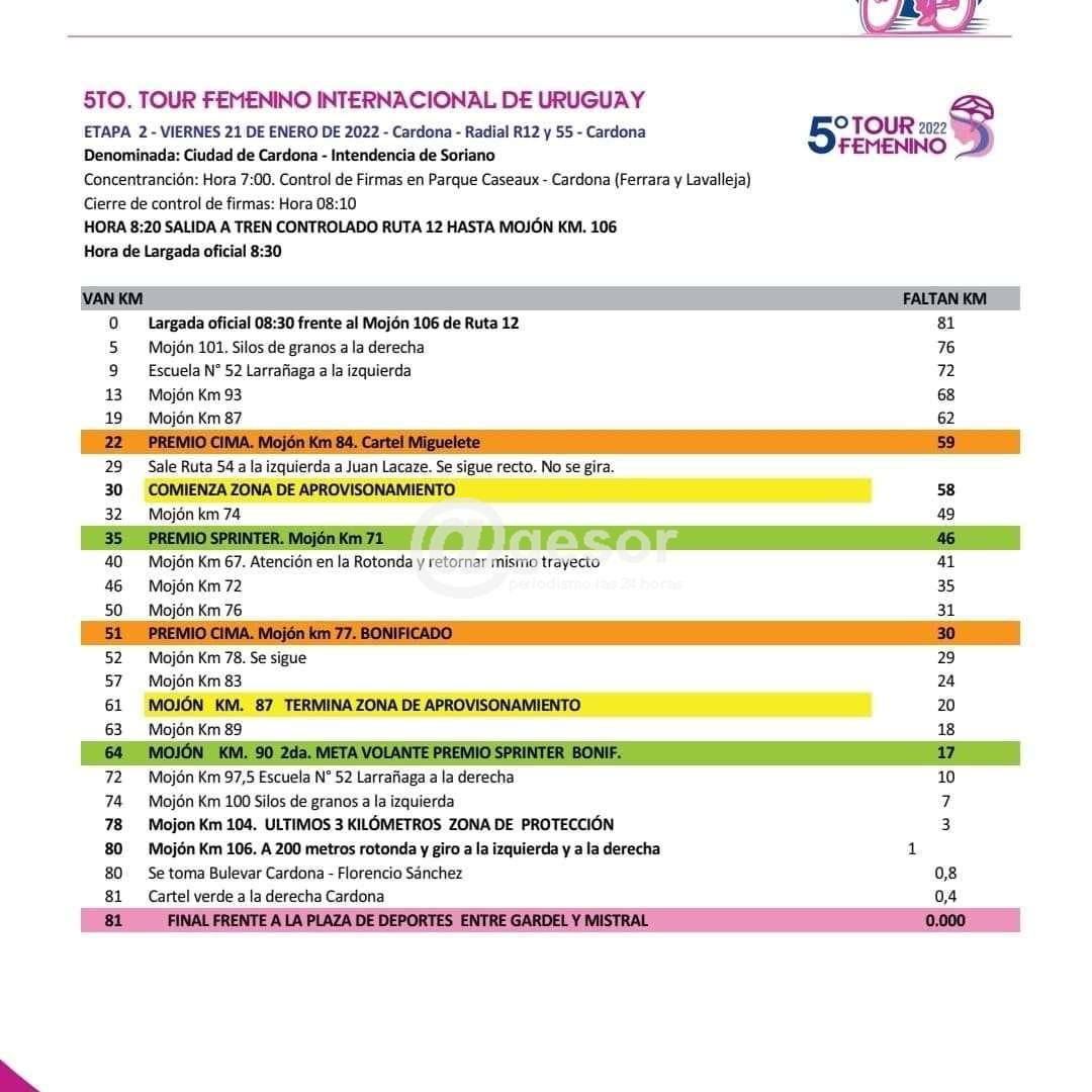 La etapa se está desarrollando este sábado 22 largando a las 8:30 hs., desde el Parque Cazeaux de Cardona con destino a Mercedes, hacia donde partió con la mala de líder la mercedaria Mariana García Britos que defiende al Club Ciclista Ciudad del Plata y estarán recorriendo con un recorrido total de 98 Km, adjunto ofrecemos la hoja de ruta, ya que se ingresará y saldrá a Palmitas..