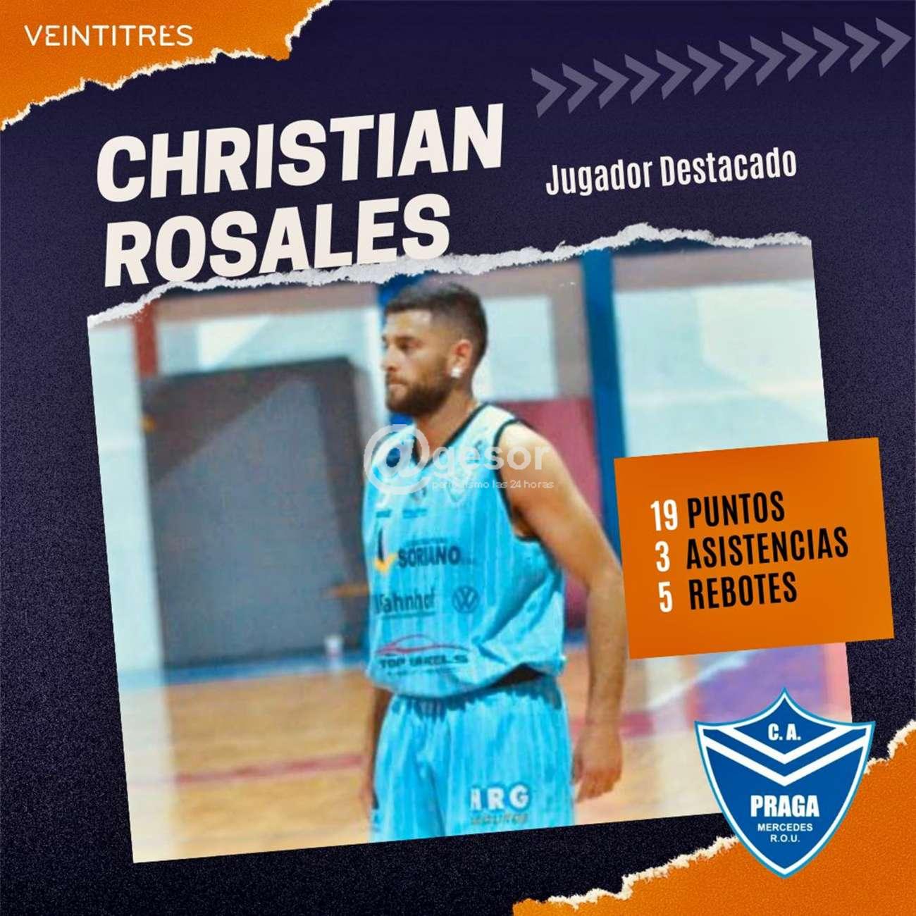 En la primera fecha de la segunda fase del 83º Campeonato Competencia de la Liga Regional de Básquetbol de Soriano, Praga obtuvo una importante victoria ante Anastasia de Fray Bentos 79 a 73, y en los celestes uno de los destacados fue el jugador Christian Rosales, representado por VEINTITRÉS, quien aportó para la victoria de su equipo, 19 puntos, 3 asistencias y 5 rebotes.