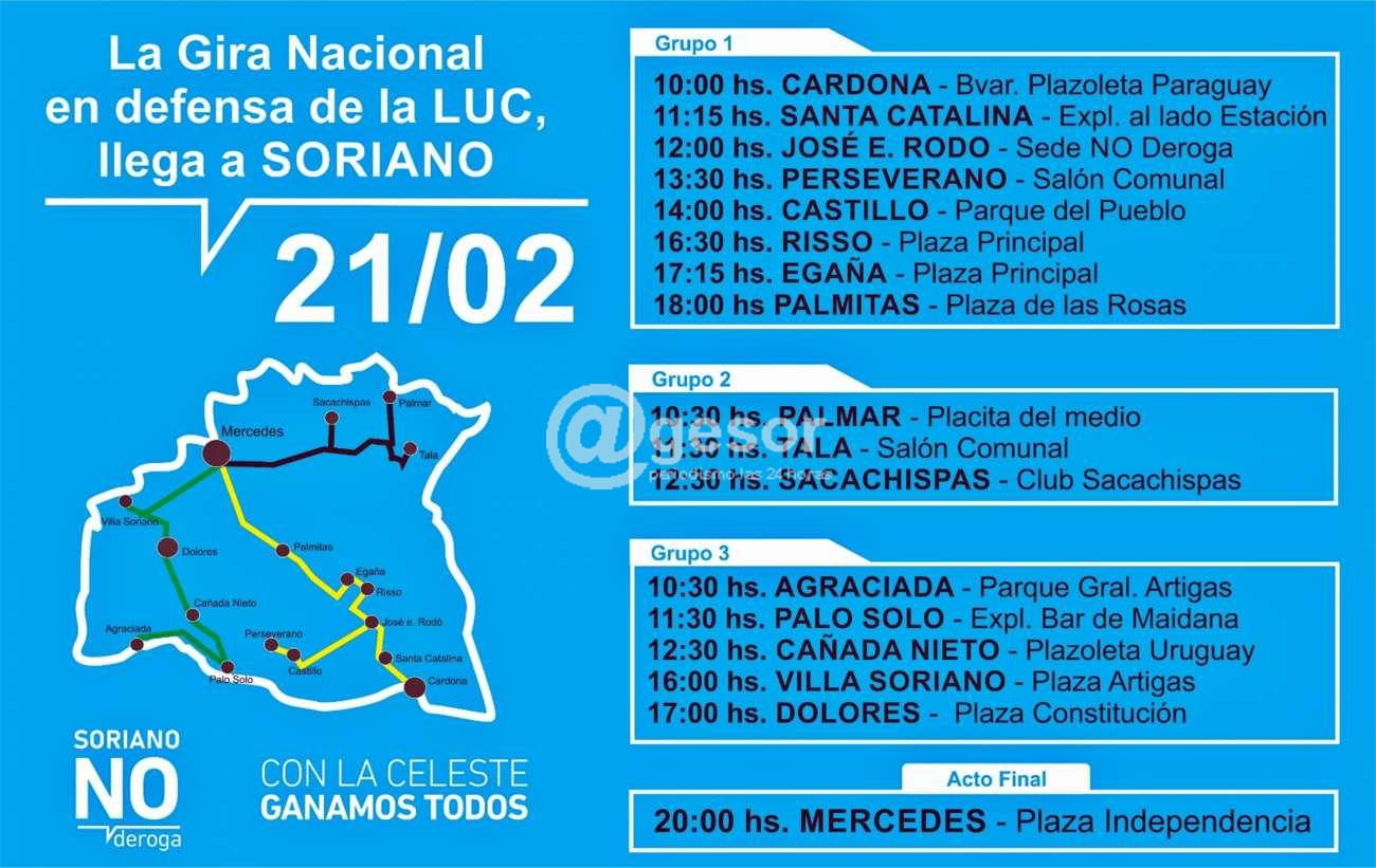 En el marco de la defensa de los 135 artículos de la LUC que se han propuesto derogar y que desde el Gobierno de coalición y los diferentes partidos que lo componen está comenzándose a recorrer el país para informar sobre los argumentos para defender que se mantengan esos 135 artículos votando la papeleta celeste con el NO el domingo 27 de marzo, este lunes 21 de febrero llegó a Soriano la gira nacional en defensa de la LUC.