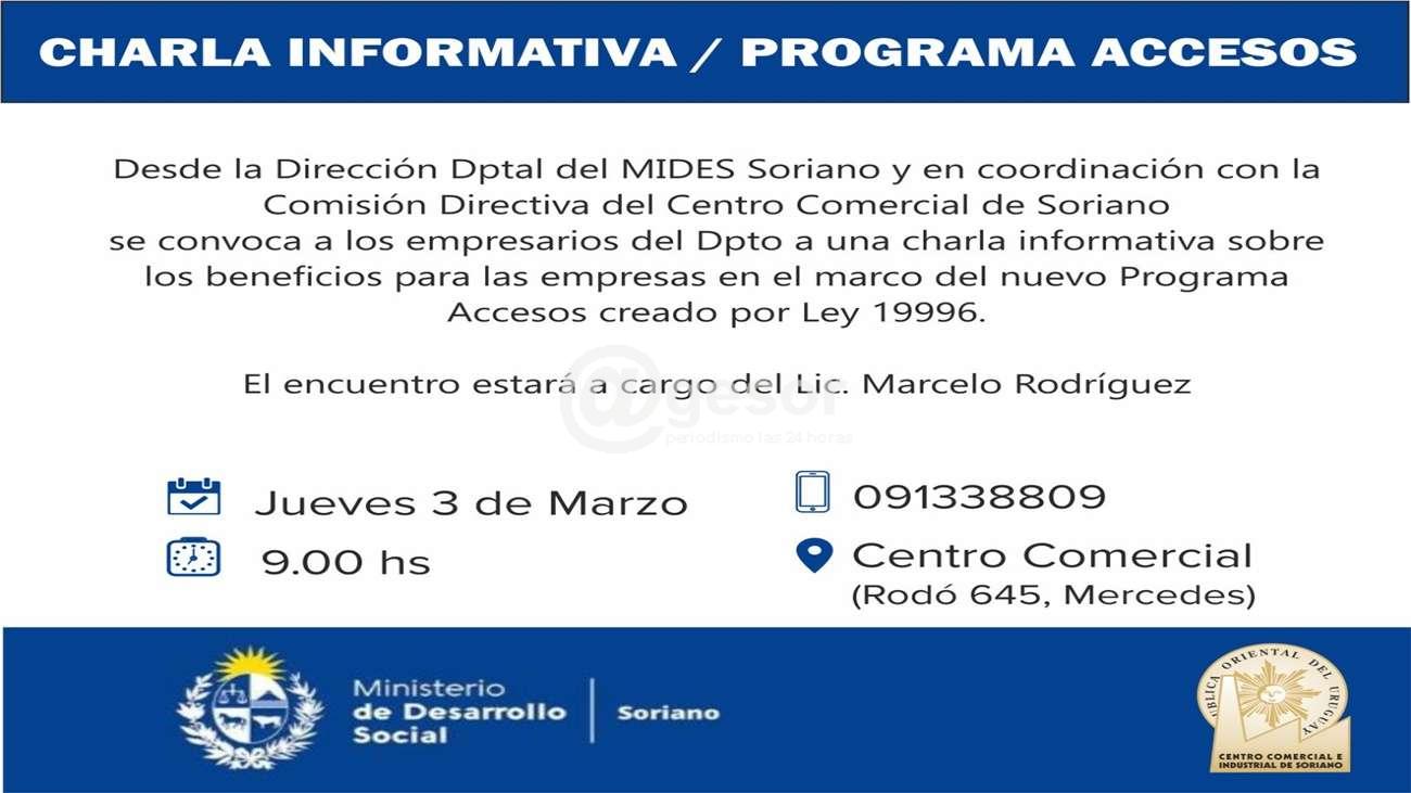 El MIDES en coordinación con el Centro Comercial e Industrial de Soriano convocan a empresarios del medio a una charla informativa sobre el Programa Accesos. La misma estará a cargo del Lic. Marcelo Rodríguez, quien expondrá sobre este nuevo programa creado por la Ley 19.996.