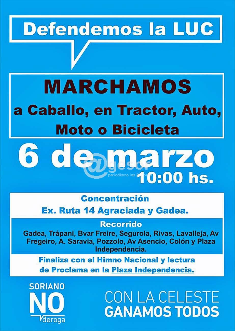 Este domingo 6 de marzo marchamos en Mercedes en defensa de la LUC, convocándose para concentrarnos a la hora 10.00 en Ruta 14 Agraciada y Gadea en barrio Treinta y Tres, para marchar a caballo, en bicicleta, moto, auto, camioneta, tractor, porque Soriano el 27 de marzo NO deroga, votamos la celeste para mantener los 135 artículos de la LUC.