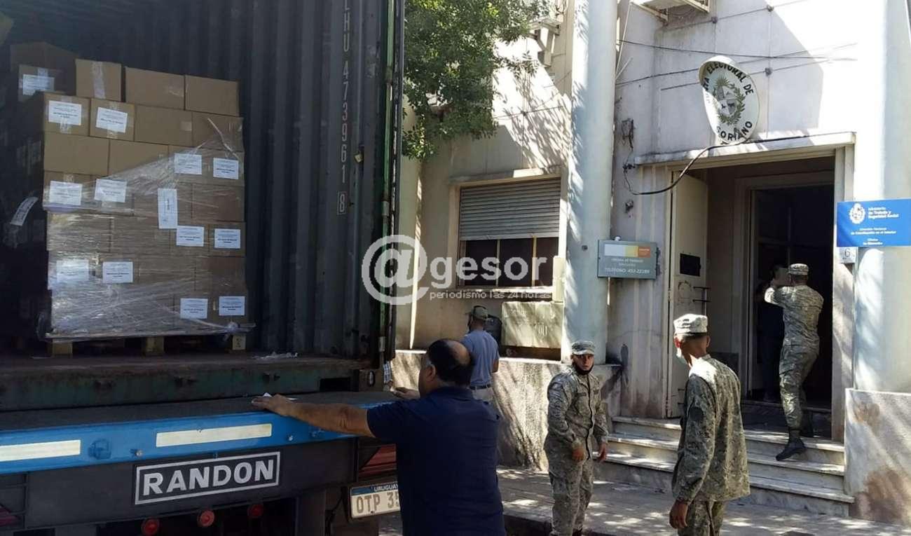 Entre lo que llegó en el camión proveniente desde la Corte Electoral, "arribaron tablets, hojas de votación, padrones, actas, sobres de votación, todo el material que se usa por parte de los integrantes de las mesas receptoras. Además de valijas, urnas, alcohol en gel para utilizar en cada una de las mesas, entre otras cosas".