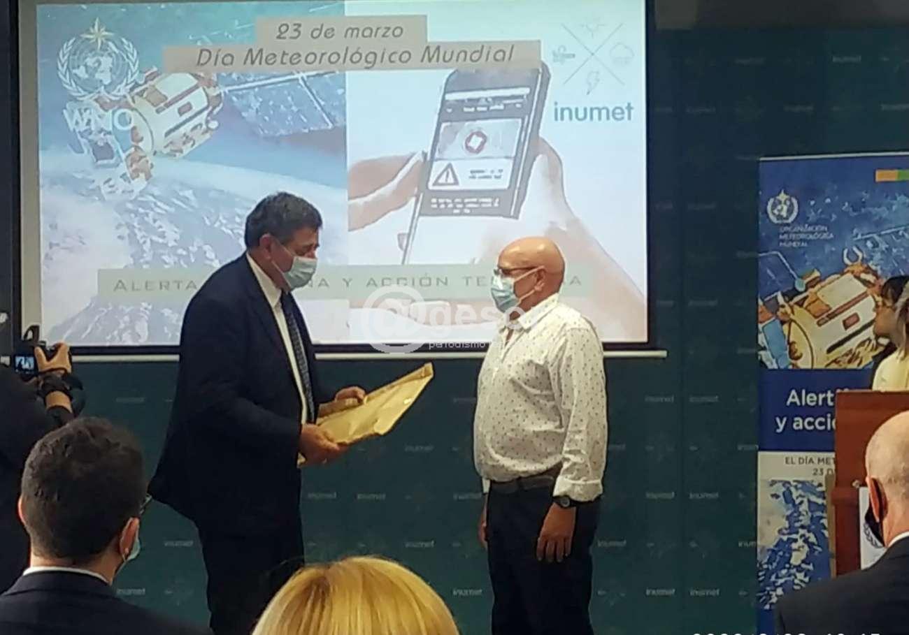 Este miércoles en la sede del Instituto Uruguayo de Meteorología (INUMET) se llevó a cabo la ceremonia de reconocimiento, donde el Jefe de la Estación Meteorológica Mercedes, Daniel Romero, recibió de manos del Sr. Morán, Gerente Técnico de INUMET, la distinción correspondiente.
