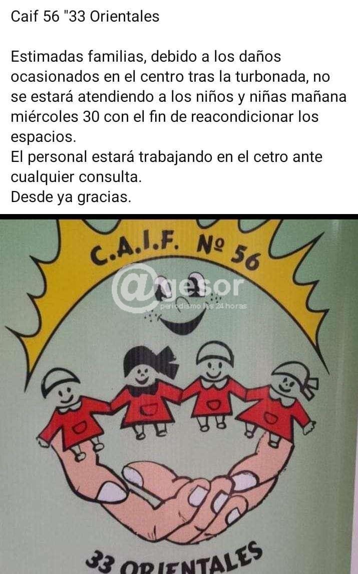 El CAIF N° 56 del Barrio 33 Orientales informa que debido a los daños ocasionados por el temporal de agua y viento no se estará atendiendo a los niños y niñas en esta jornada ya que se procederá a reacondicionar los espacios. “El personal estará trabajando en el centro ante cualquier consulta” agrega el comunicado del Caif 56 33 Orientales.