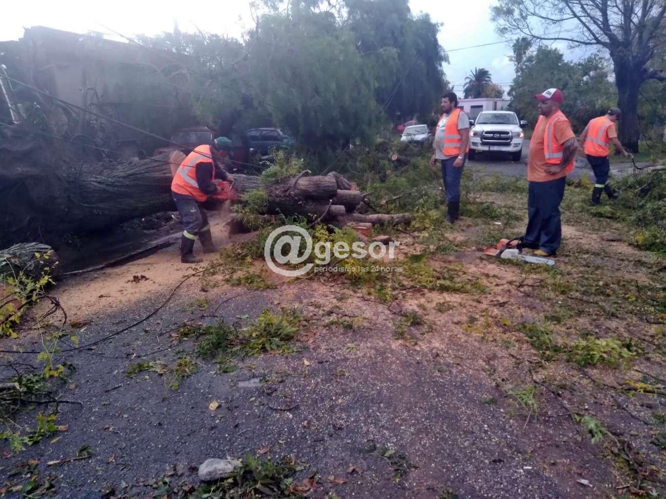 En tanto equipos del Departamento de Higiene trabajan a esta hora para recolectar chapas y otros elementos que se acumularon dentro de los patios de fincas particulares debido al viento.
