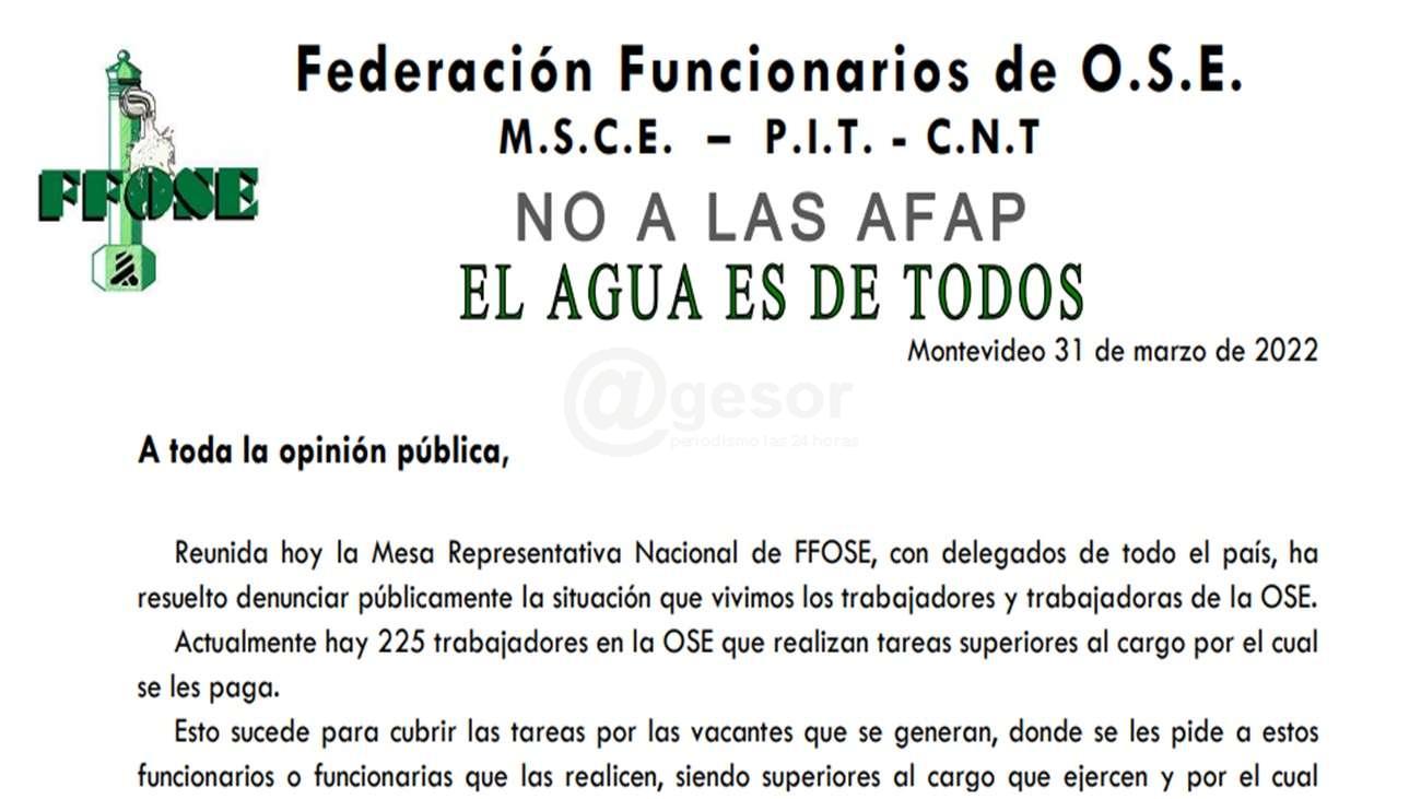La Federación Funcionarios de O.S.E. emitió un comunicado denunciando la situación que atraviesan. "Hay 225 trabajadores en la OSE que realizan tareas superiores al cargo por el cual se les paga", expresa la FFOSE. "El Directorio de OSE, se nos ha llegado a plantear que los trabajadores “tengamos paciencia” y que los trabajadores “esperen”, aunque irónicamente, si durante esa “espera” un trabajador comete un error en esa tarea por la cual no se le paga, la OSE lo sancionara".
