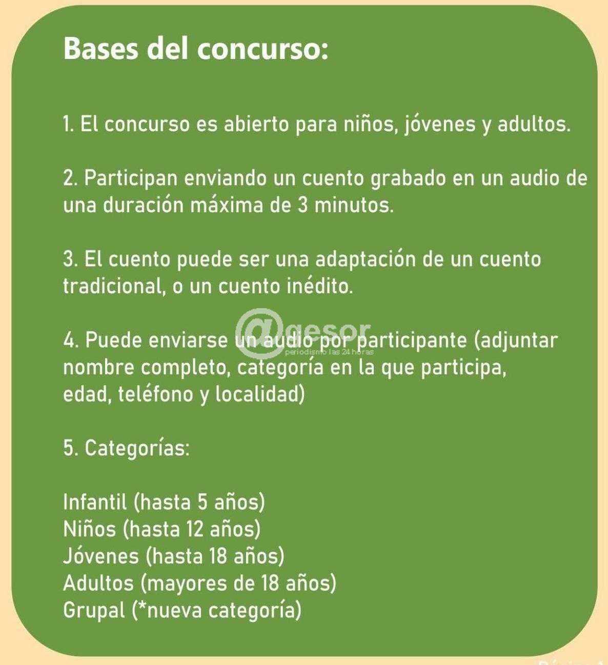 Premios: 1er premio para cada categoría, el jurado tendrá la potestad de realizar menciones especiales, además se premiará el cuento más original.