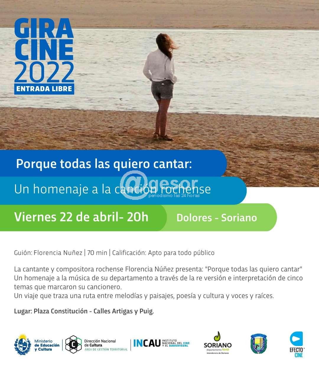 Gira Cine 2022 llega este viernes a la ciudad de Dolores. Un evento a auspiciado por el Ministerio de Educación y Cultura, la Dirección Nacional de Cultura, el Instituto Nacional del Cine y el audivisual, la Intendencia de Soriano, el Municipio de Dolores y Efecto Cine. En la oportunidad se exhibirá el documental “Porque totas las quiero cantar” un homenaje a la canción rochense.