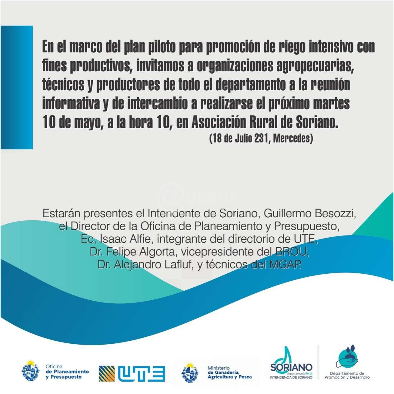 Se realiza este martes la reunión en el marco del plan piloto para incentivar el riego intensivo con fines productivos que promueven OPP (Oficina de Planeamiento y Presupuesto), UTE, MGAP e Intendencia de Soriano.