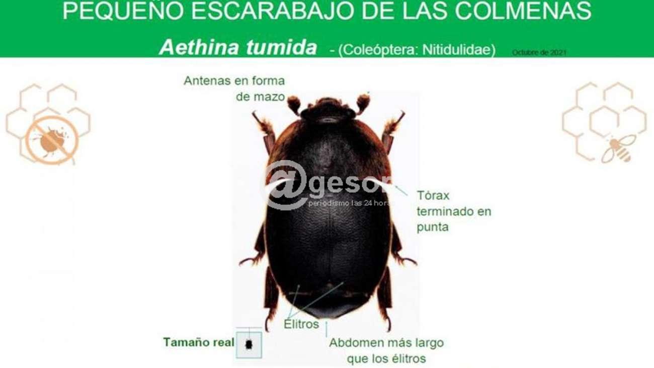 Aethina tumida, también conocido como el “pequeño escarabajo de la colmena” (PEC), es un parásito originario de las regiones tropicales y subtropicales situadas a sur del Sahara Africano, que afecta colmenas de la abeja Apis mellifera. El parásito es de declaración obligatoria para los países miembros de la Organización Internacional de Epizootias (OIE).