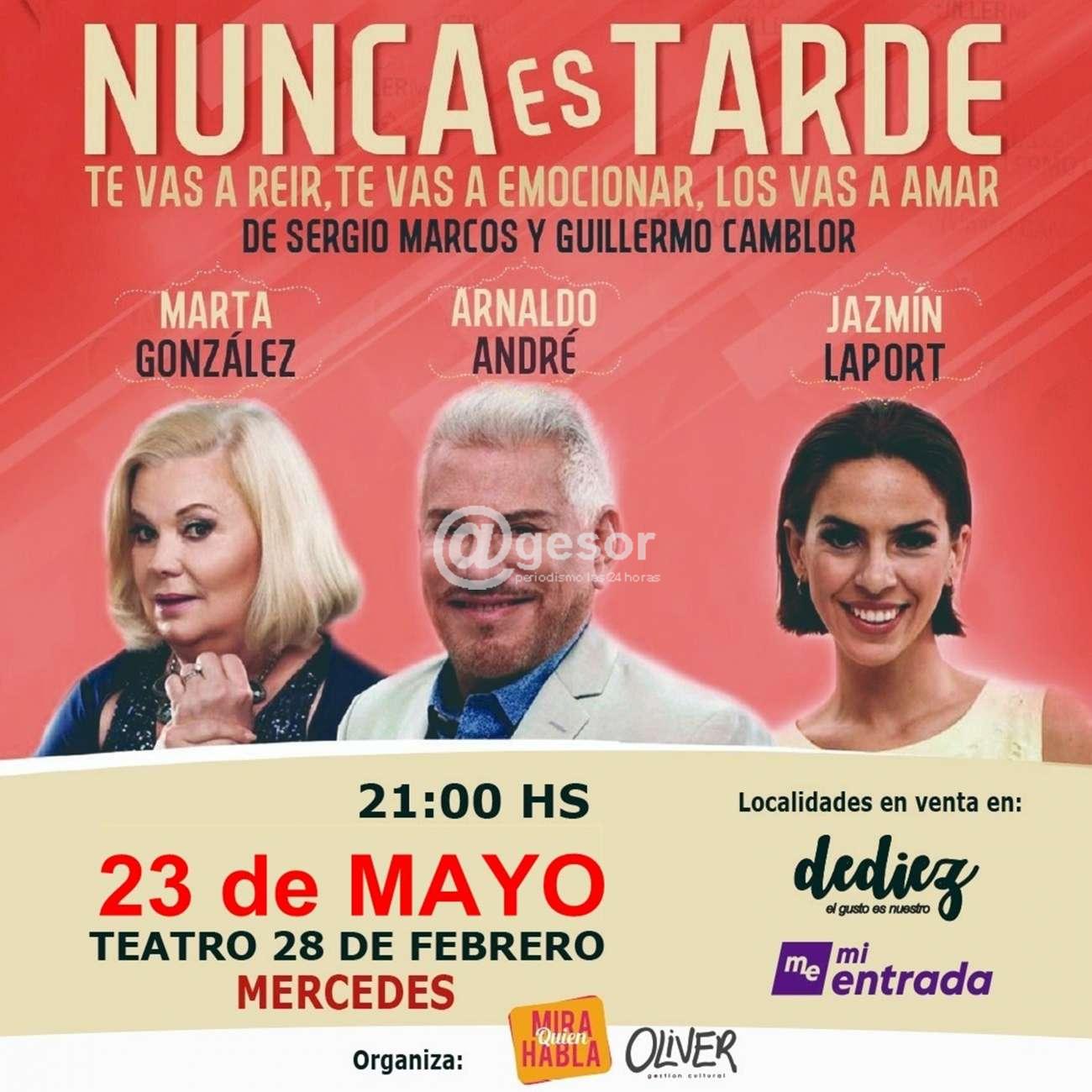 Este martes 17 de mayo a las 21.00 horas el Teatro 28 de Febrero de Mercedes (Soriano), iba a ser el escenario de la presentación de la obra "Nunca es tarde" de Sergio Marcos y Guillermo Camblor, con la actuación de Arnaldo André, Marta González y Jazmín Laport, pero las condiciones meteorológicas y anuncios de fuertes vientos y lluvias hizo que como medida de prevención la organización, decidiera postergar la presentación para este lunes 23 de mayo en el "28 de Febrero" y aquellos que adquirieron las entradas mantienen lógicamente su vigencia.