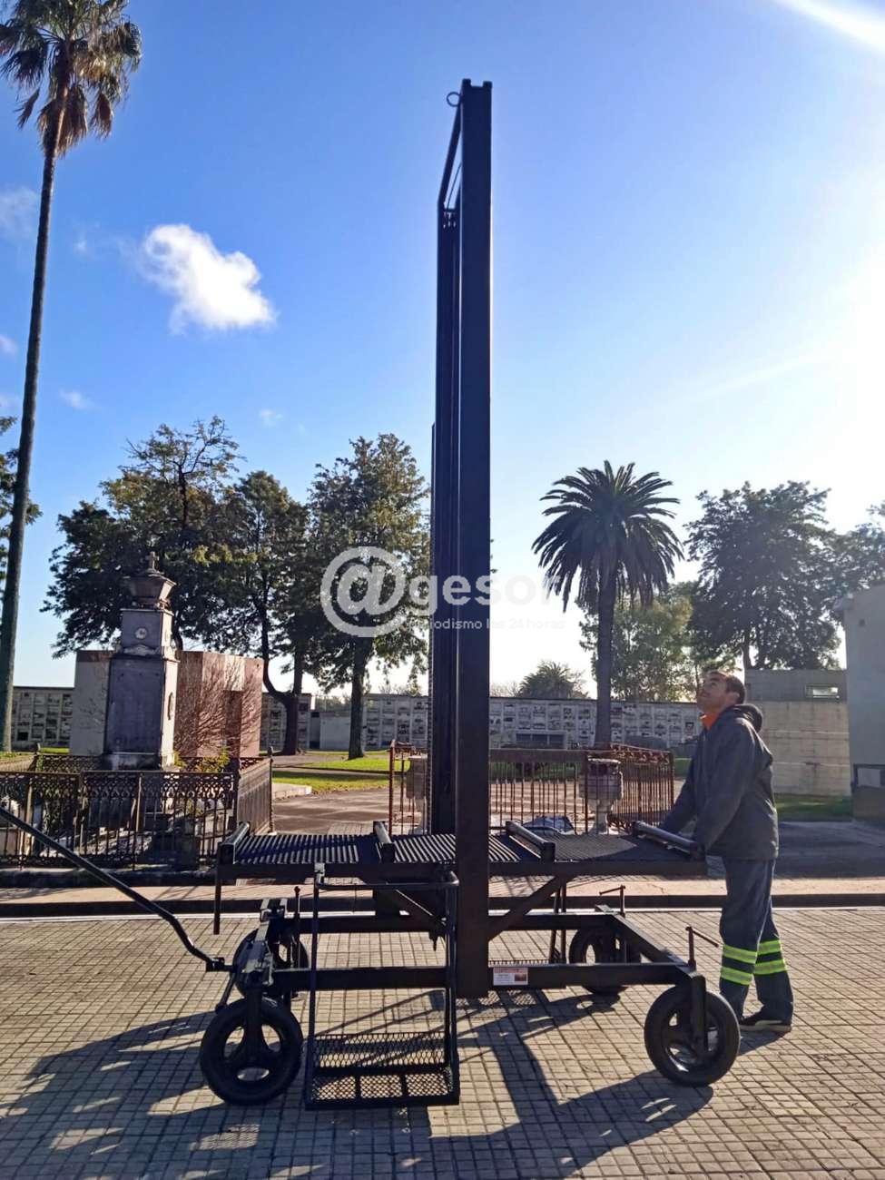 Dicho elemento es autónomo, funciona a batería y tiene una capacidad de carga de 500 kg, lo que permite elevar los féretros al nivel de los nichos superiores así como también a dos operarios que realizan la tarea en altura con seguridad.