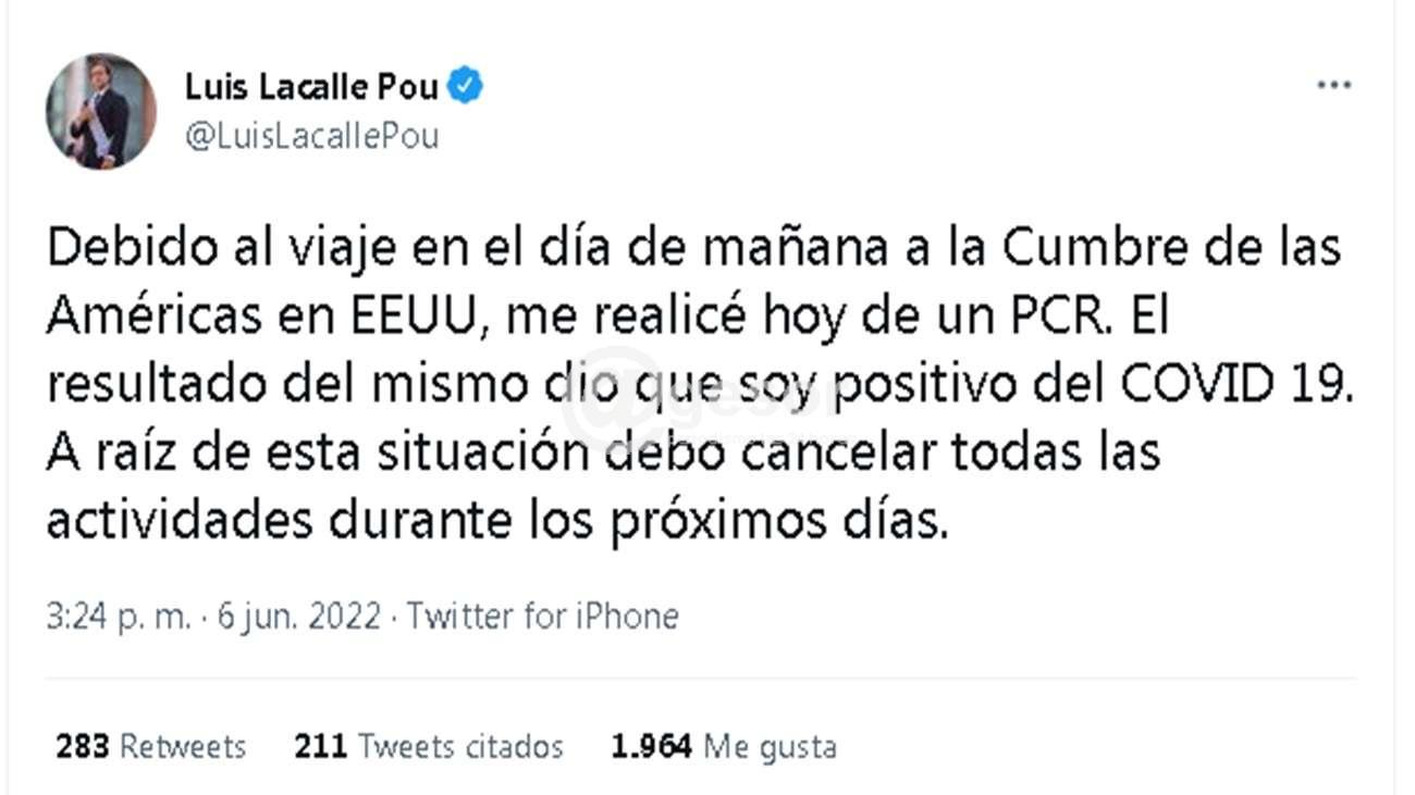 "Debido al viaje en el día de mañana a la Cumbre de las Américas en EEUU, me realicé hoy de un PCR. El resultado del mismo dio que soy positivo del COVID 19. A raíz de esta situación debo cancelar todas las actividades durante los próximos días".