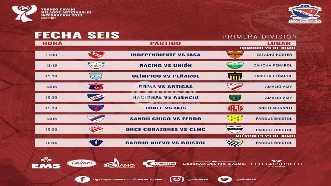 Se fijó la sexta fecha con grandes partidos, el que robará todas las miradas será el que disputen el domingo hora 11 en el Estadio el puntero Sud América contra el segundo Independiente, recordemos que el líder cuenta con 15 puntos y el rojo tiene 13 puntos, ambos vienen invictos. En cancha de Peñarol a primera hora, 13 y 15 juegan Racing vs Unión y a segunda hora 15 y 30 en otro gran encuentro juegan Olímpico vs Peñarol. En la cancha del CAI juegan a primera hora Roma vs Artigas y a segunda hora Nacional vs Asencio. En el Moranti se juega un solo partido a las 15 y 30 Tunel vs Juventud. En la cancha de bristol juegan Sandú Chico vs Ferro y a segunda hora Once Corazones vs CLMC . Mientras que el miércoles 29 juegan Bristol que se encuentra disputando el Torneo de OFI contra Barrio Nuevo a las 19 y 45 en cancha del Bohemio.-