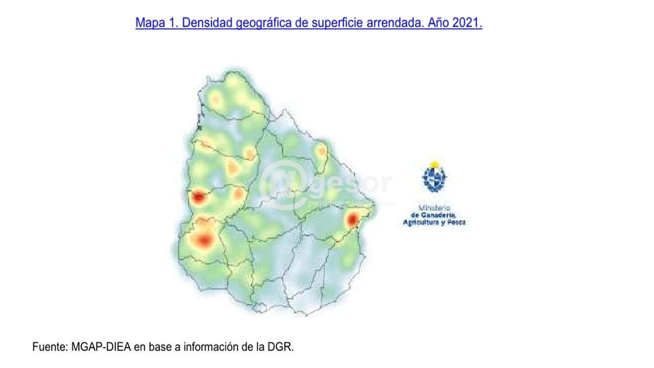 Los departamentos con más superficie arrendada fueron, por su orden: Paysandú, Soriano y Río Negro, sumando un área de 279.171 hectáreas, lo que representa el 31 % del arrendamiento del año.