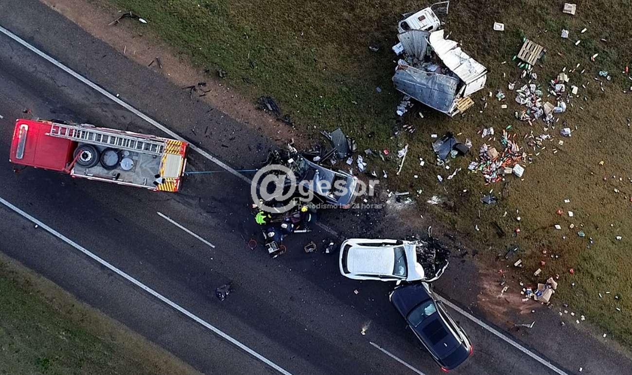 Desde Policía Caminera se informó que el siniestro de tránsito ocurrido en las primeras horas de la mañana de este jueves, se produjo de acuerdo a la primera versión recogida en el lugar, Ruta 2 a la altura del km 286, que camión de pequeño porte circulaba al Sur, camioneta Audi que lo hacía en el mismo sentido lo embiste por alcance, el camión por el impacto cruza de senda y choca frontalmente con auto matriculado en Argentina que circulaba en sentido contrario, detrás de éste lo hacía una camioneta BMW que no logra frenar e impacta la primera camioneta Audi.