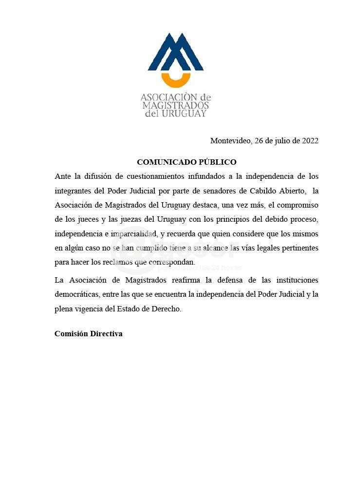 La Asociación de Magistrados del Uruguay emitió un comunicado respondiendo a los cuestionamientos recibidos de parte de Cabildo Abierto. Reafirmando “una vez más, el compromiso de los jueces y las juezas del Uruguay con los principios del debido proceso, independencia e imparcialidad, y recuerda que quien considere que los mismos en algún caso no se han cumplido tiene a su alcance las vías legales pertinentes para hacer los reclamos que correspondan”.