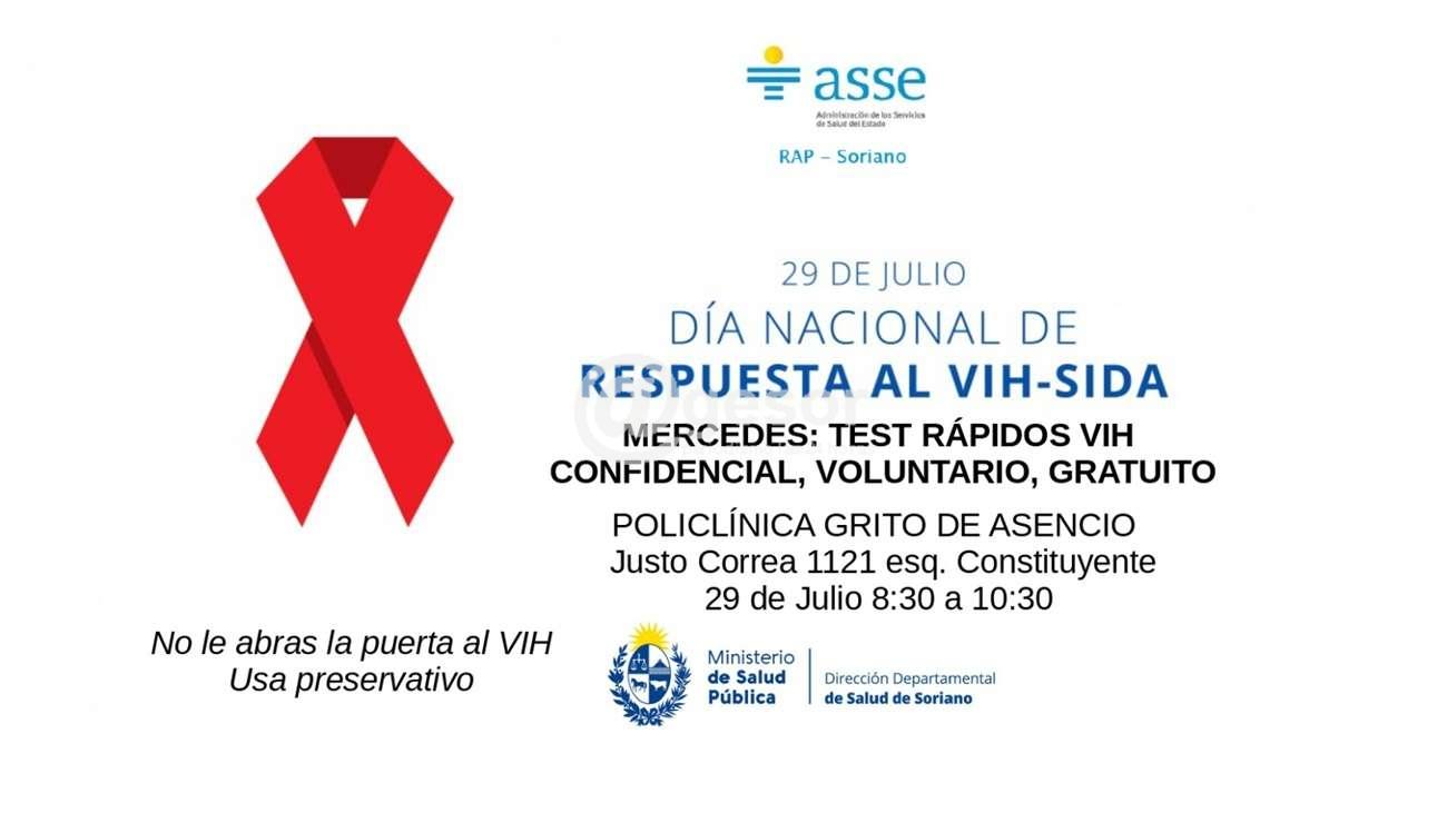 Este vienes en el marco del día nacional de respuesta al VIH - SIDA se estarán realizando test rápidos. Será en la Policlínica Grito de Asencio, de Mercedes (Justo Correa 1121 esquina Constituyente) entre las 8,30 a 10,30 horas.