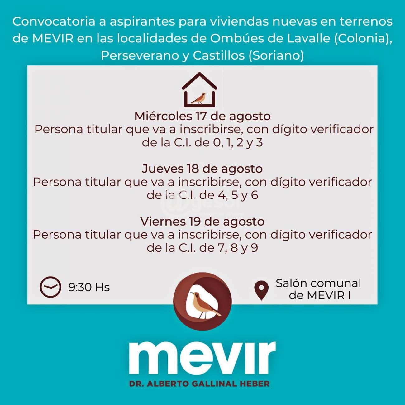 Convocatoria a aspirantes para viviendas nuevas en terrenos de MEVIR en las localidades de Ombúes de Lavalle (Colonia), Perseverano y Castillos (Soriano).