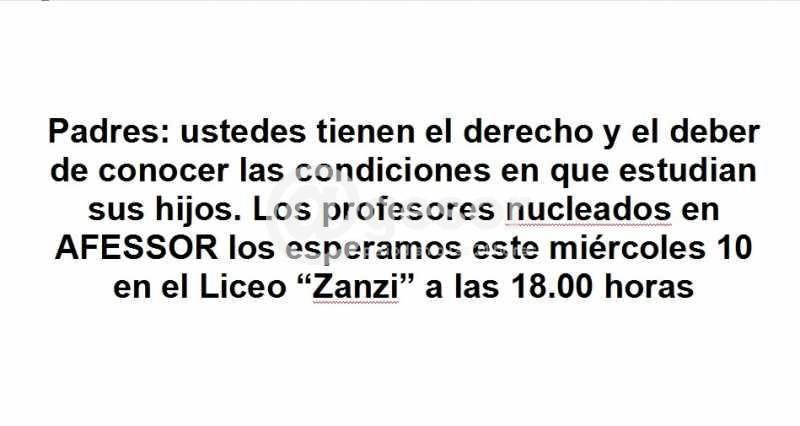 Padres: ustedes tienen el derecho y el deber de conocer las condiciones en que estudian sus hijos. Los profesores nucleados en AFESSOR los esperamos este miércoles 10 en el Liceo "Zanzi" a las 18.00 horas