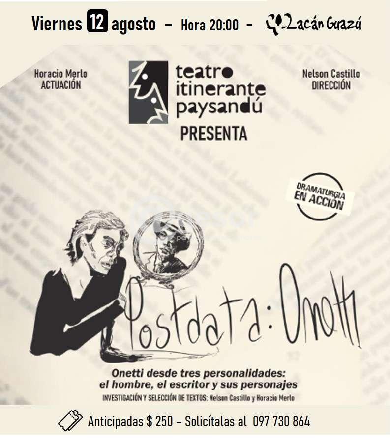 Este viernes  en el  Museo Lacán Guazú de Dolores se presenta Teatro itinerante de Paysandú, con la  obra “Postdada:  Onetti”.  Una  obra de teatro protagonizada por Horacio  Merlo con la dirección de  Nelson Castillo.
