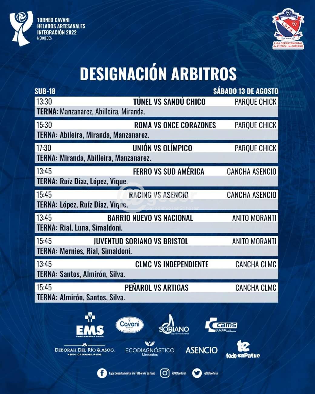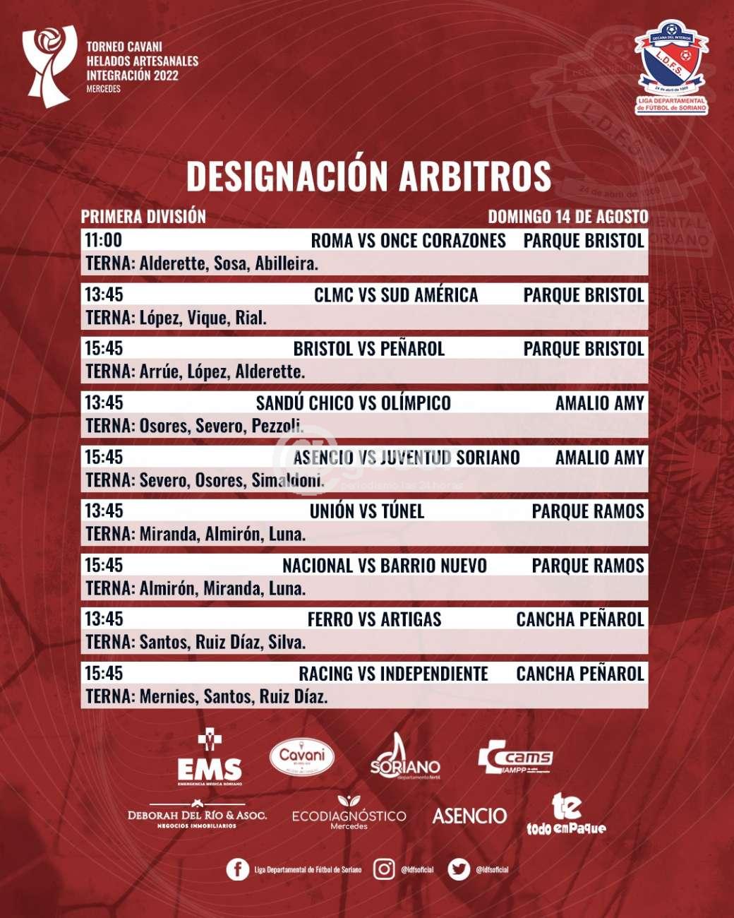 El Colegio de Arbitros de la Liga Departamental de Fútbol de Soriano dio a conocer los jueces para la fecha del Clasificatorio del Competencia de este fin de semana, destacándose que el líder Bristol que enfrenta a Peñarol tendrá como terna arbitral en el parque bohemio a Arrúe, López y Alderette; el encuentro entre Racing e Independiente en cancha aurinegra será conducido por Mernies, Santos y Ruiz Díaz. Mientras tanto el juego televisado del domingo a la mañana que disputarán Roma vs. Once Corazones en el parque Bristol será arbitrado Alderette, Sosa y Abilleira.