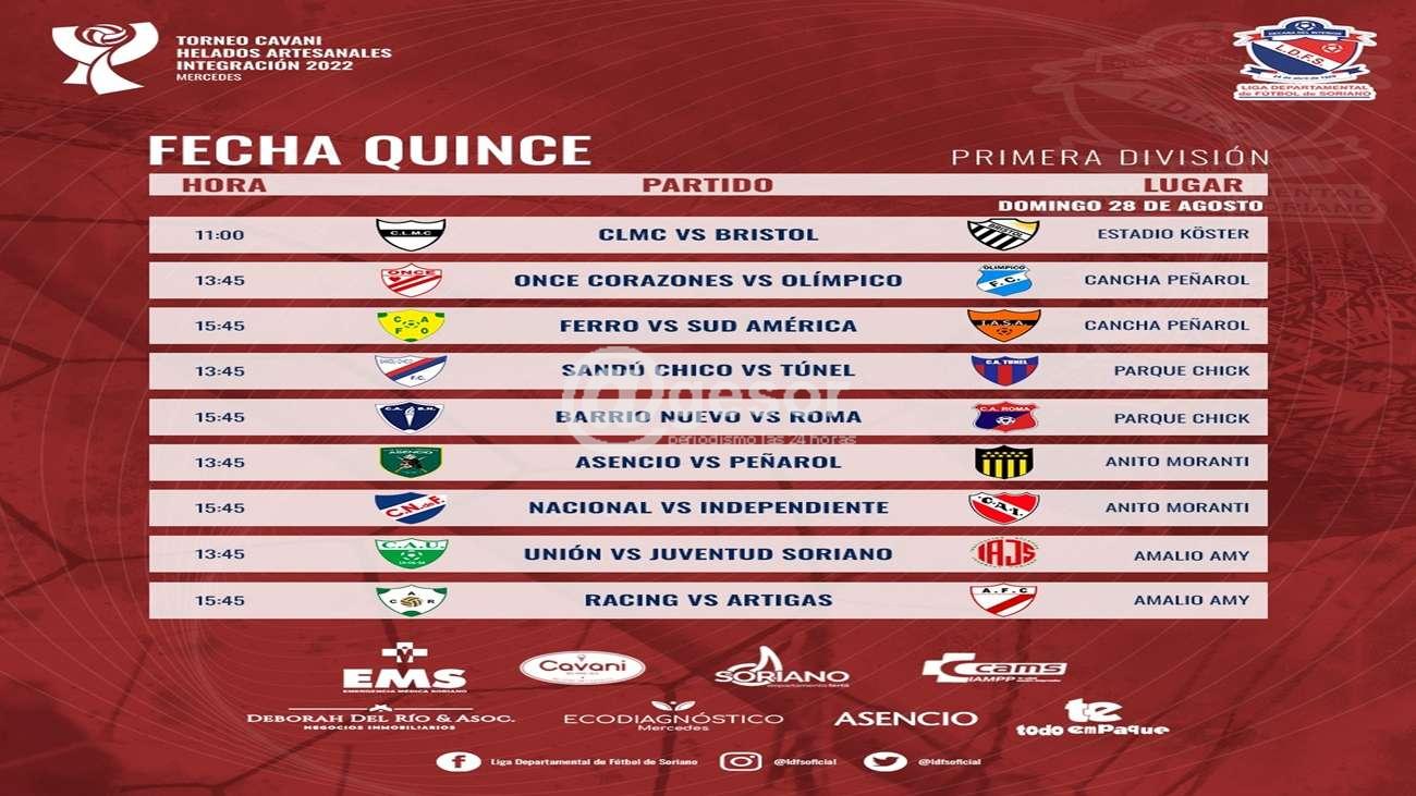 Se fijó una nueva fecha, la quince del torneo con los siguientes partidos, el domingo y para la TV se juega el clásico entre CLMC vs Bristol, hora 11 en el Estadio Koster. En cancha de Peñarol juegan a primera hora Once Corazones vs Olímpico y a segunda hora el clásico Ferro vs IASA. En el Parque Chick juegan a primera hora 13 y 45 Sandú vs Túnel y a segunda hora 15 y 45 Barrio Nuevo vs Roma. En el Morantti juegan Asencio vs Peñarol a primera hora y a segunda Nacional vs Independiente. En el Amy juegan a primera hora Unión vs Juventud Soriano y a segunda hora 15 y 45 juegan Racing vs Artigas.