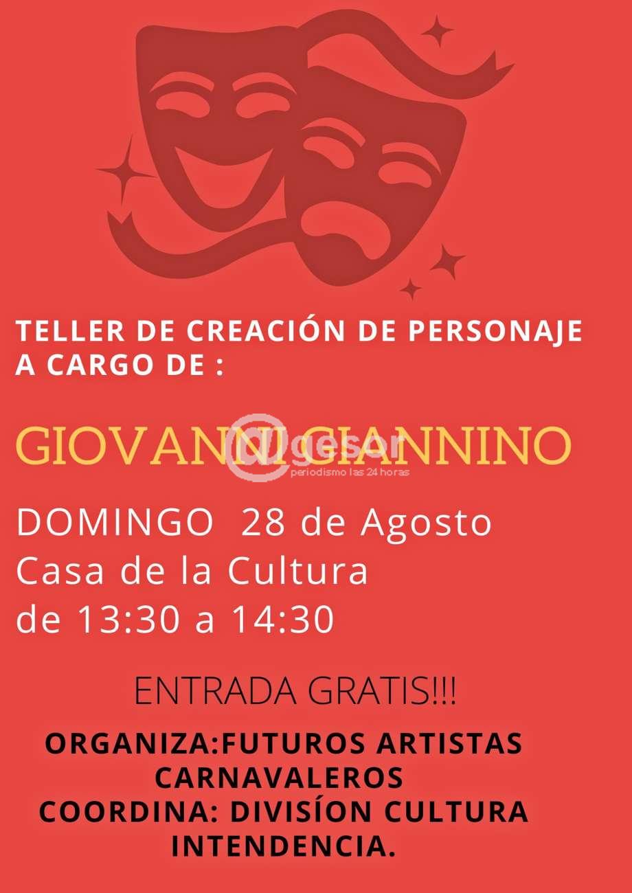 Este domingo 28 de agosto en Casa de la Cultura de 13.30 a 14.30 horas organizado por Futuros Artistas Carnavaleros, se desarrolla taller de creación de personaje a cargo de Giovanni Giannino, con la coordinación de la División Cultura de la Intendencia de Soriano, con entrada gratis.