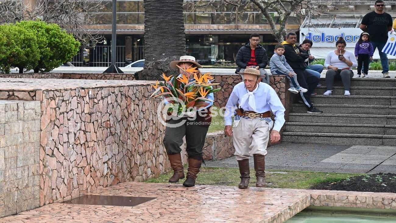 Una vez arribados los marcheros, se procedió a colocar la ofrenda floral, a presentar la placa conmemorativa de los 80 años del monumento al Gaucho de Asencio y a entonar estrofas de nuestro Himno Patrio, todo lo cual se realizó fuera de protocolo ya que la lluvia continuaba de manera intermitente.