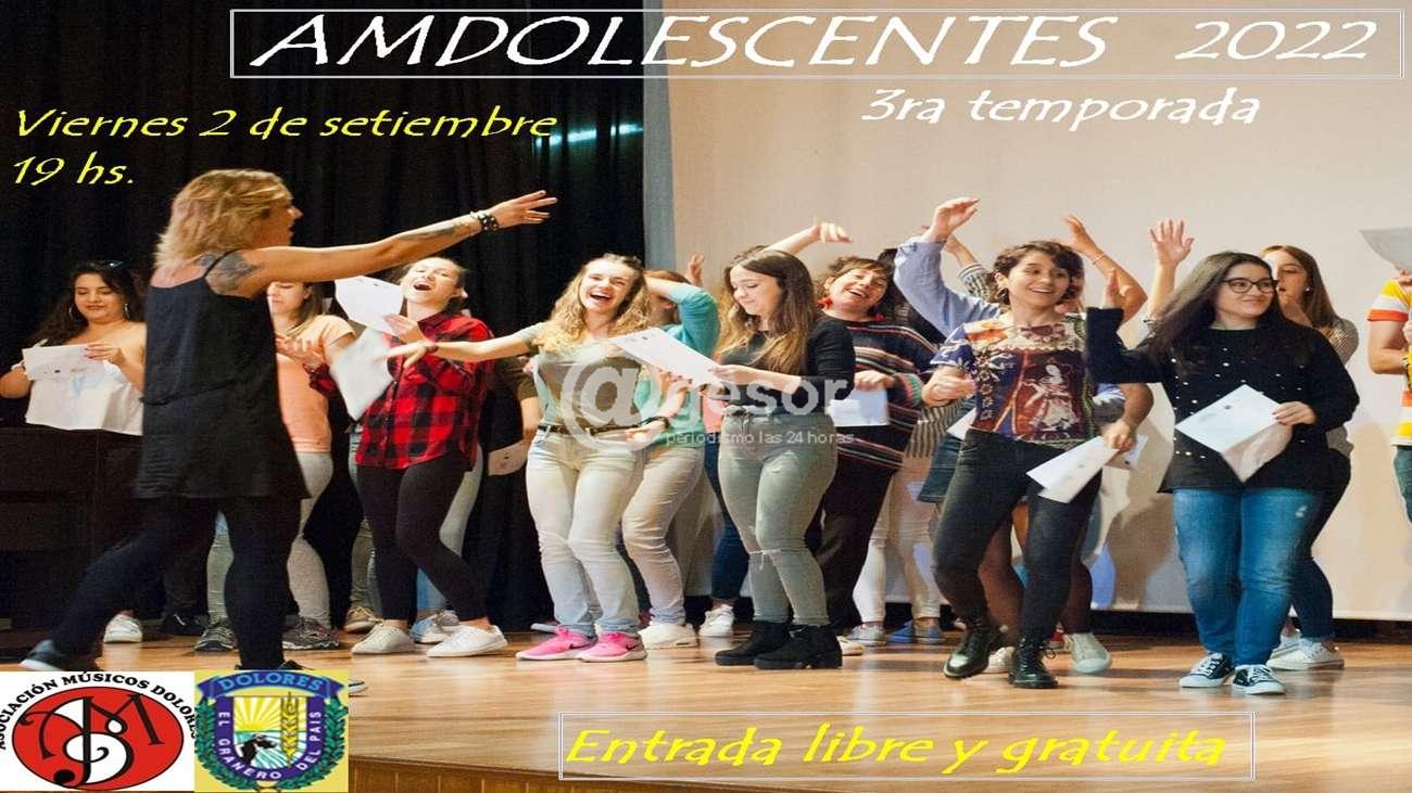 Viernes 2 de setiembre se realiza la tercera temporada de Amdolescentes. Un espectáculo artístico donde los adolescentes son los protagonistas. Ya está confirmada la participación de alumnos de la Escuela Paso a paso que dirigen Walmar Torres y Gabriela Cornú. Además, solistas y dúos de los Liceos 1 y 2 de Dolores. El cierre estará a cargo de los coros liceales de nuestra ciudad que dirige Joel Gonnet.