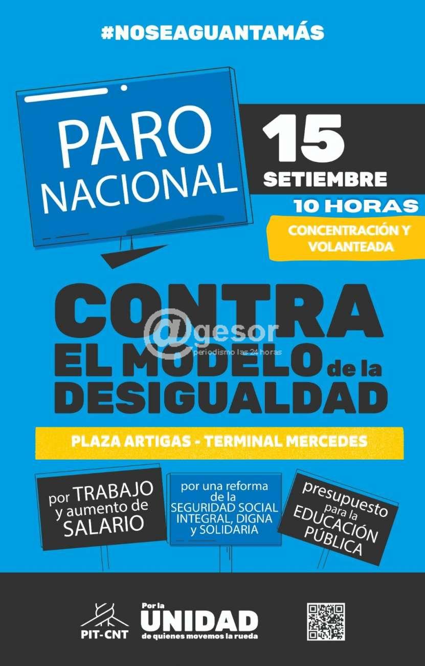 Con la consigna “Contra el modelo de la desigualdad” el PIT CNT convoca al paro nacional que se realizará este jueves 15 de setiembre. El Plenario Intersindical de Soriano se suma a esta movilización reclamando por trabajo y aumento de salario, por una reforma de la Seguridad Social integral, digna y solidaria, y por presupuesto para la educación pública.