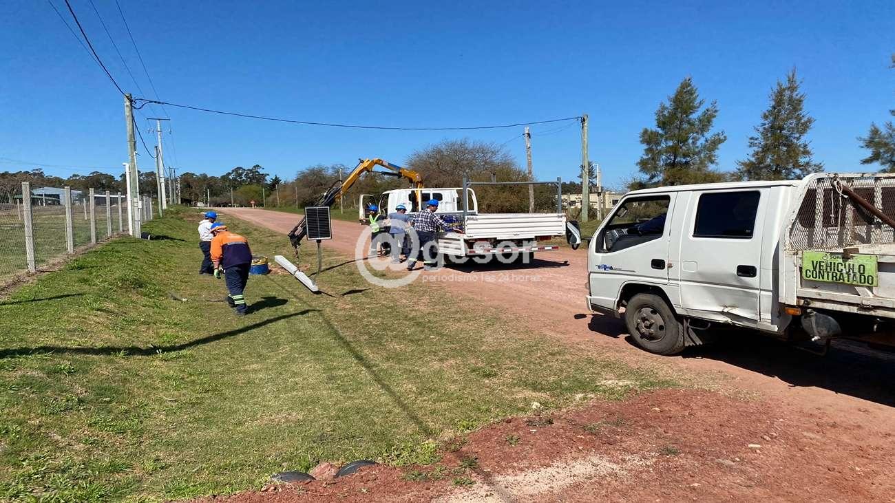 Allí se realizó la instalación de 6 luminarias LED autónomas (alimentadas con paneles solares individuales) en un tramo del camino que va desde escuela Nº 110 hacia el este y su desvío hasta unirse con ruta 14 a la altura del km. 2, extendiendo la iluminación desde el sector donde ya se cuenta con luminarias cableadas.
