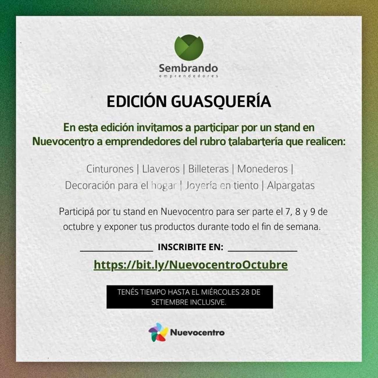 El Edil José Lavista informa: "a todos los emprendedores de Guasquería del departamento, que el programa Sembrando mediante inscripción gratuita vía web, permite participar por un stand, para exhibir los productos en Montevideo en el Nuevo Centro Shopping, el segundo fin de semana de octubre de 2022".