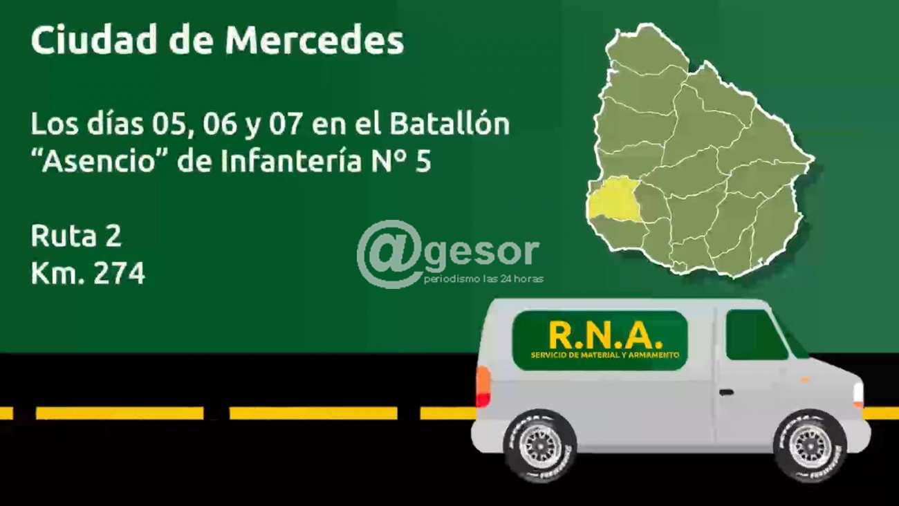 El Servicio de Material y Armamento informa a los ciudadanos, que el Registro Nacional de Armas se encontrará en la ciudad de Fray Bentos los días 3 y 4 de octubre en sede del Batallón "Rincón" de Infantería Mecanizado Nº 9 en continuación Sarandí; y en la ciudad de Mercedes los días 5, 6 y 7 de octubre en la sede del Batallón "Asencio" de Infantería Nº 5 en Ruta 2 a la altura del km 274.