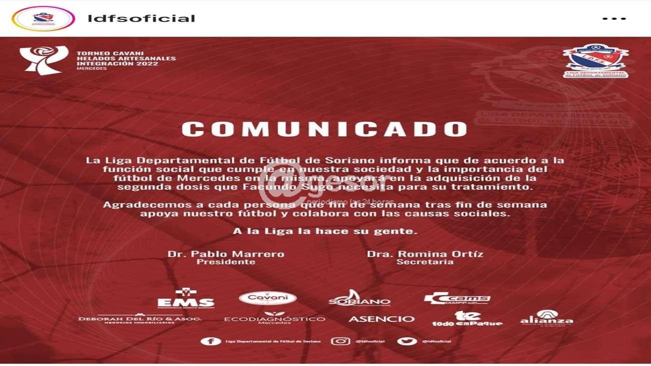 El Dr. Pablo Marrero, presidente de la Liga de Fútbol informó a @gesor que en la reunión del día de ayer del Consejo Directivo de la Liga Departamental de Fútbol de Soriano se procedió a demostrar una vez más por los Clubes la responsabilidad social que tiene nuestra liga para con la población. En ese sentido se decidió apoyar de forma unánime por las instituciones la adquisición de la segunda dosis que requiere el joven Facundo Sugo para su tratamiento médico. “La liga cumple una función social en nuestra sociedad y la importancia del Fútbol es brindar respuestas a estos problemas, no se puede estar ajeno a las realidades de las personas y más en cuestiones vinculadas a la salud, como también es una forma de retribuir a la comunidad el apoyo que cada fin de semana se obtiene por los espectadores que disfrutan de nuestro fútbol y adquieren sus entradas”, comentó Marrero.