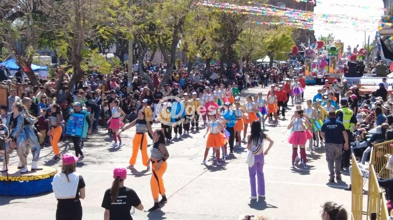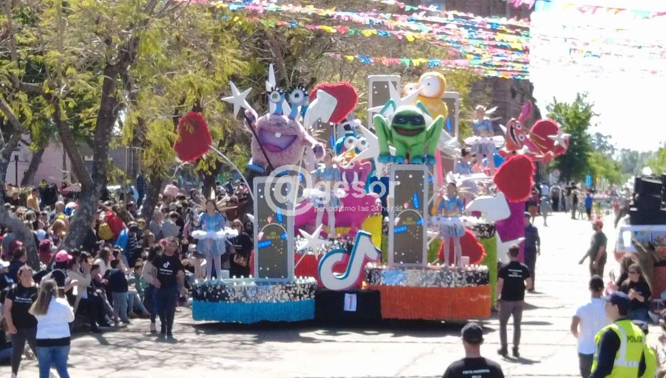 El primer carro en hacer su pasaje ante la concurrencia que en gran número se apostó durante el recorrido en el marco de la edición 60ª de la Fiesta Nacional de la Primavera fue el de los Primeros Unidos del Liceo Nº 2 ¨Juan Bautista Herrero¨ denominado ¨Tik Tok Party¨ con sus princesas aspirantes a Pimpollo Angie Correa, Belén Oehler, Melina Ortega, Magalí Otarola, Camila Torres, Luisana Pérez, Emilia Zucaret.