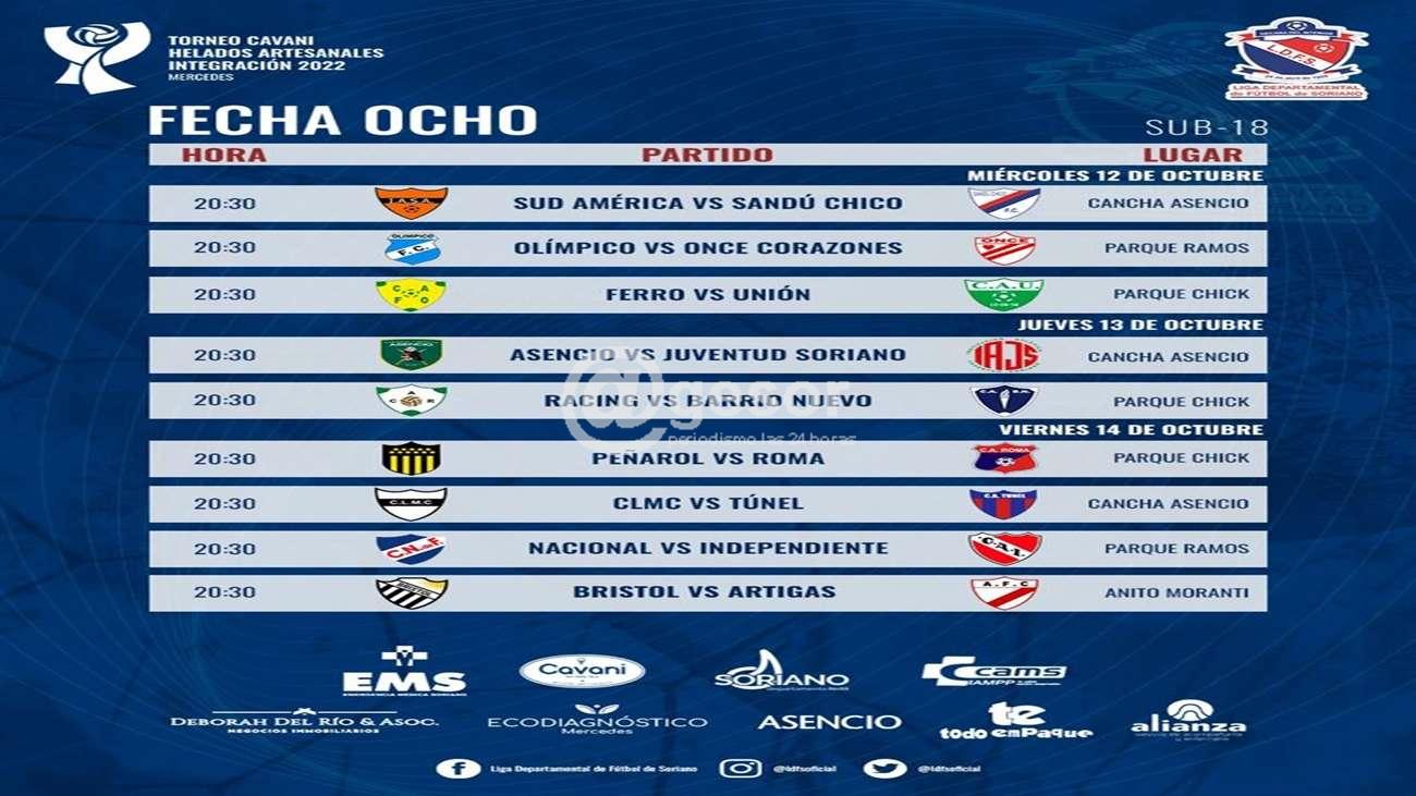 Nueve partidos conforma a octava fecha del torneo Integración de la categoría Sub 18 de fútbol mercedario. Los mismos se disputarán en tres etapas, miércoles, jueves y viernes en canchas de Asencio, Parque Ramos, Parque Chick, cancha de Asencio y en el Anito Moranti.