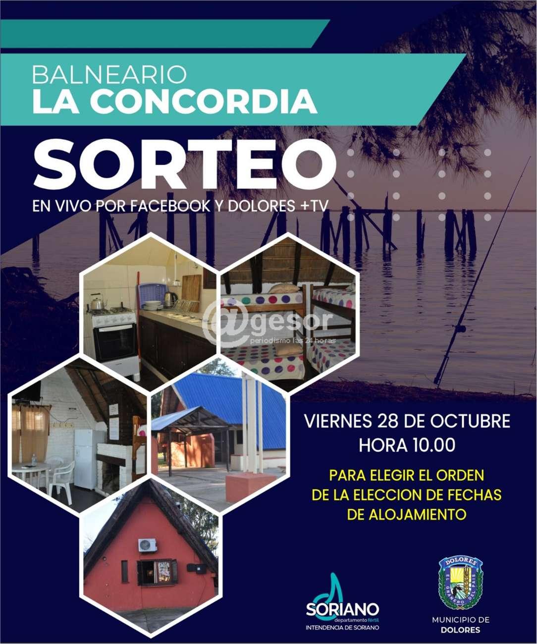 El Municipio de Dolores informa que este viernes 28 de octubre a las 10:00 horas "transmitiremos por nuestra página de Facebook y por el canal Dolores +TV (105sd y 259hd), el sorteo de orden de elección de las cabañas del balneario La Concordia.