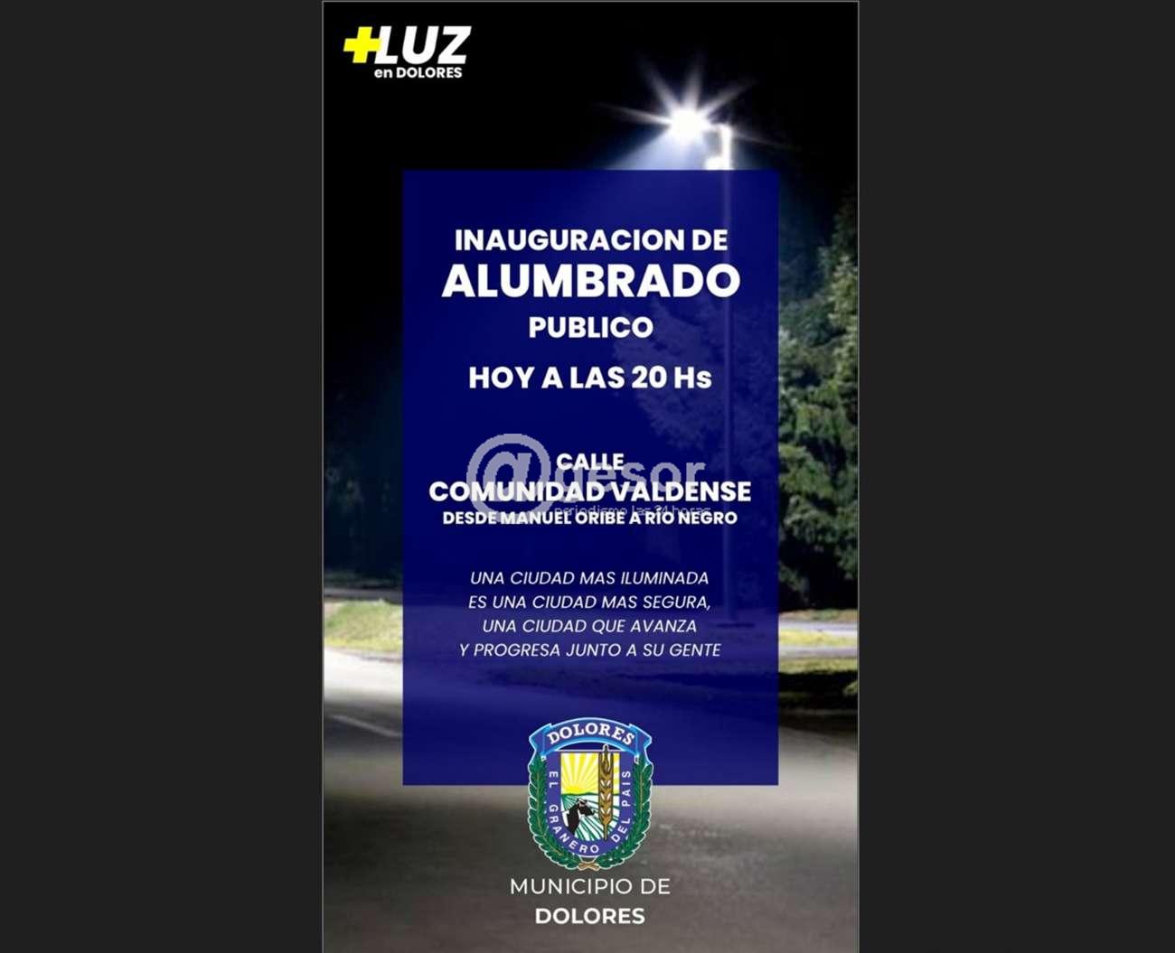 El Municipio de Dolores está invitando a la inauguración del alumbrado público, a desarrollarse hoy a las 20.00 horas en calle de Comunidad Valdense desde Manuel Oribe a Río Negro.