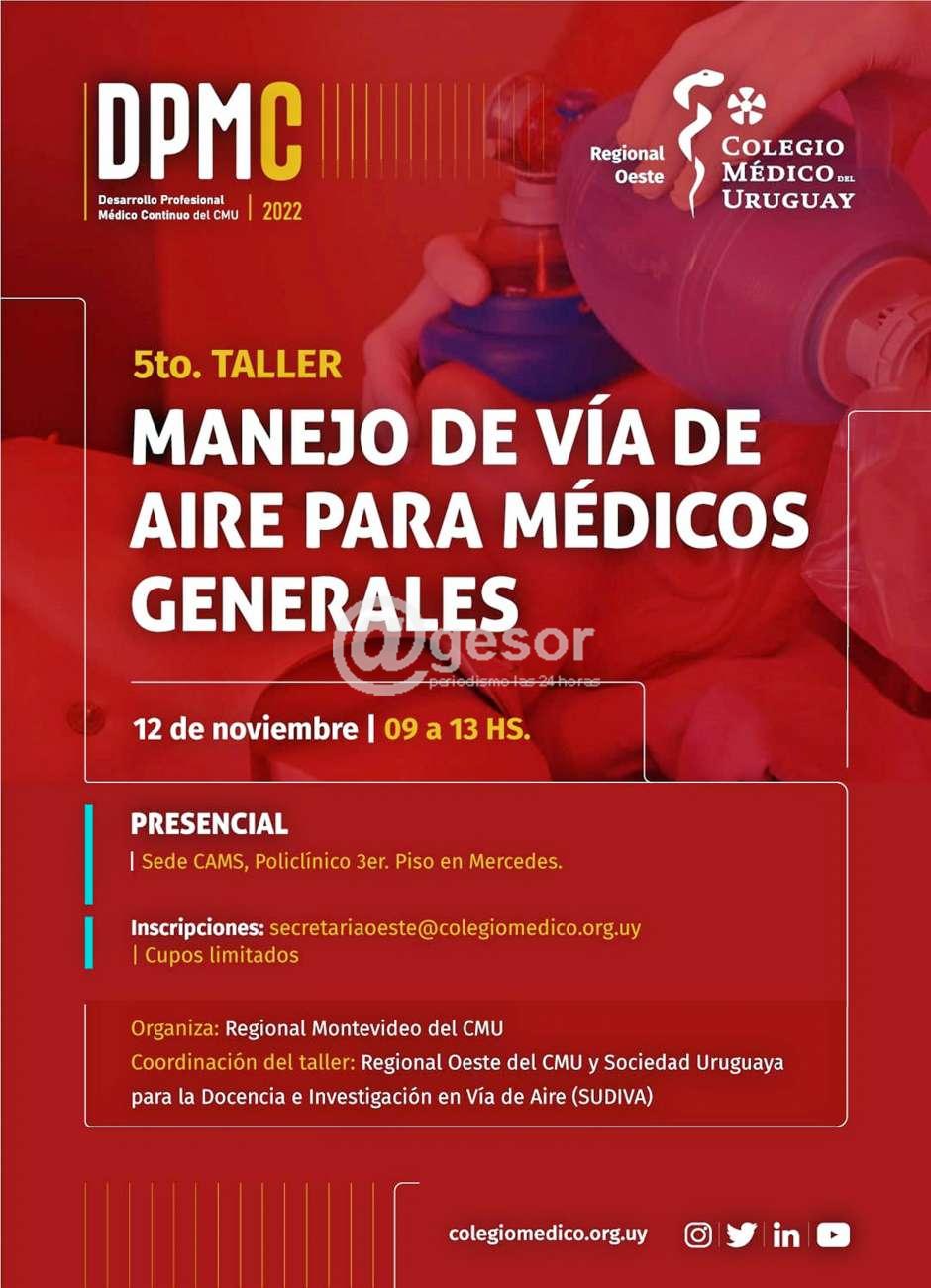 El Colegio Médico del Uruguay, con la coordinación de la Regional Oeste, por medio del área de Desarrollo Profesional Médico Contínuo del CMU, y la Sociedad Uruguaya para la Docencia e Investigación en Vía de Aire (SUDIVA), está organizando el 5º Taller sobre "Manejo de vía de aire para médicos generales", a desarrollarse el sábado 12 de noviembre de 9.00 a 13.00 horas. Será de carácter presencial, en el Policlínico de CAMS en sede del tercer piso en 18 de Julio entre Sánchez y Rodó de Mercedes, y las inscripciones, con cupos limitados se realizan en secretariaoeste@colegiomedico.org.uy