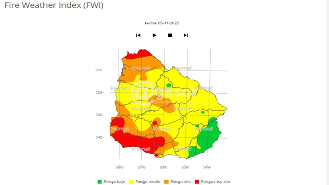 El índice de riesgo de incendio, monitoreo constante que realiza Inumet, ubica a una importante porción del departamento de Soriano con un riesgo alto de probabilidad de incendios forestales.