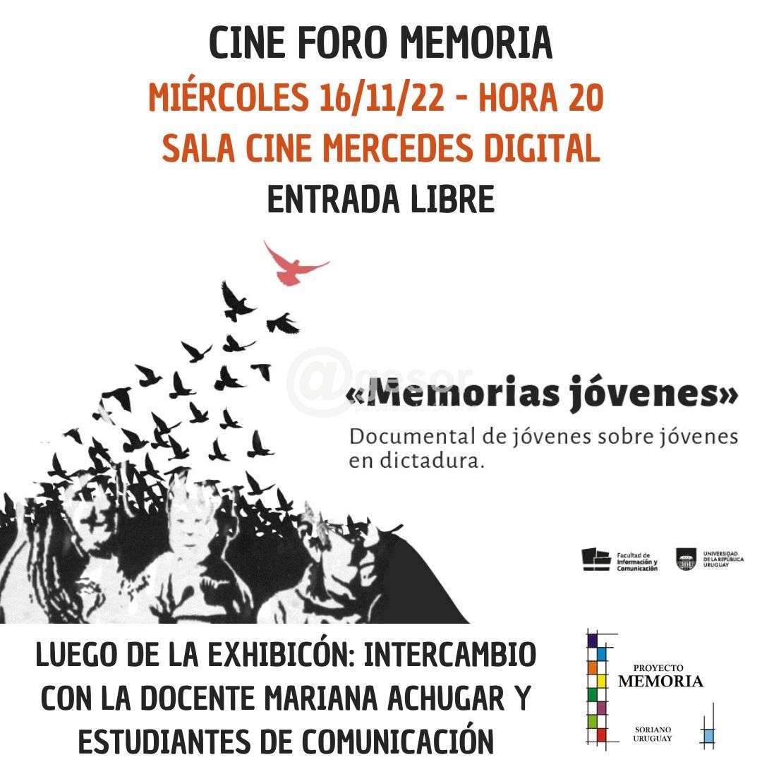 La Comisión Memoria, Justicia y  contra la Impunidad de Soriano continúa este miércoles  16 de noviembre con el ciclo  de Cine Foro Memoria. Esta semana se proyectará la película “Memorias jóvenes” un  documental  de jóvenes sore jóvenes en dictadura.