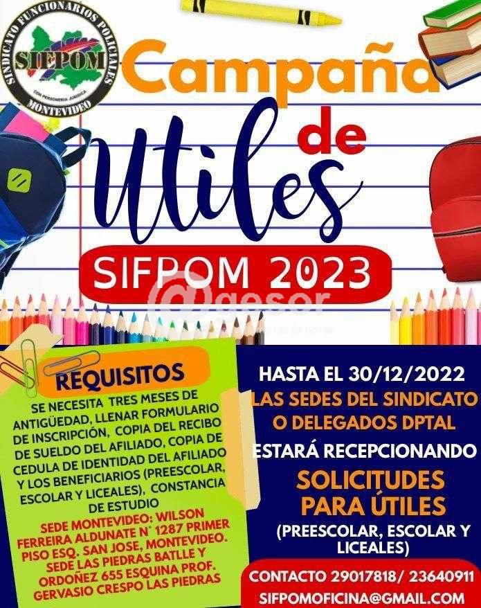 SIFPOM (Sindicado Único de Funcionarios Policiales) lanzó su campaña de útiles 2023. Para eso convoca a todos aquellos funcionarios policiales con hijos en edad preescolar, escolar o liceal a que se inscriban. Los útiles serán entregados en el 2023, junto con el comienzo del año lectivo.