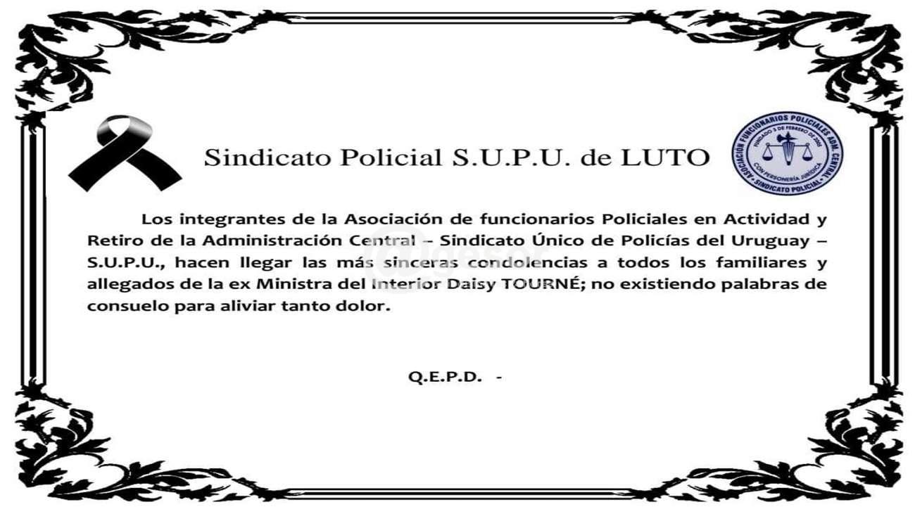 Los integrantes de la Asociación de funcionarios Policiales en Actividad y Retiro de la Administración Central -Sindicato Único de Policías del Uruguay- SUPU, hacen llegar las más sinceras condolencias a todos los familiares y allegados de la ex Ministra del Interior Daisy TOURNÉ; no existiendo palabras de consuelo para aliviar tanto dolor.